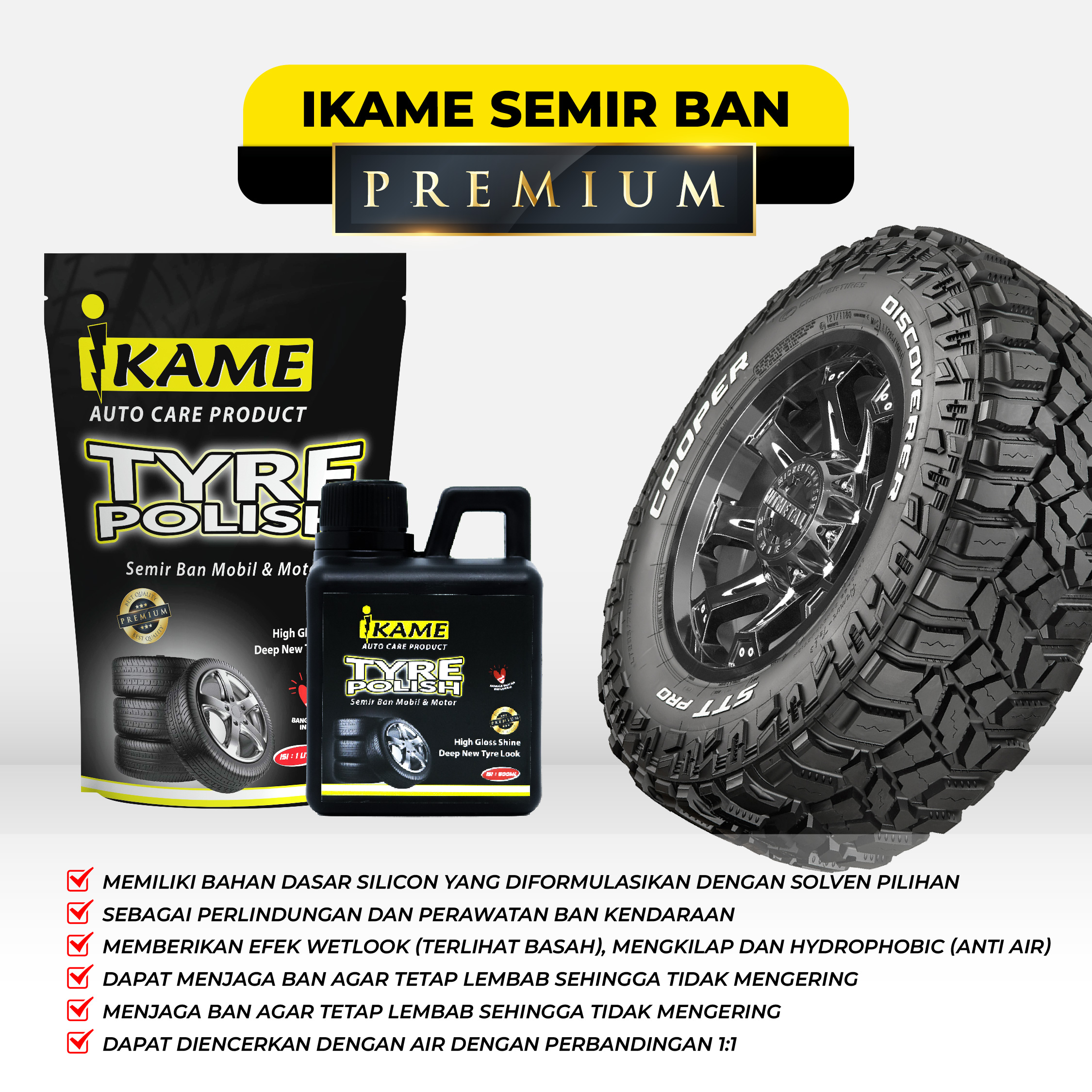 Semir ban ikame terbukti aman digunakan pada ban mobil dan motor, di formulasikan khusus menggunakan bahan baku berkualitas yang tahan air, sehingga menjaga ban mobil  tetap hitam mengkilap dan bahkan setelah dicuci atau terkena air hujan. Penggunaannya juga sangat mudah, hanya dengan mengoleskannya dengan kuas, serta aroma yang segar, membuat ban mobil dan motor anda terlihat mengkilap sepanjang hari.